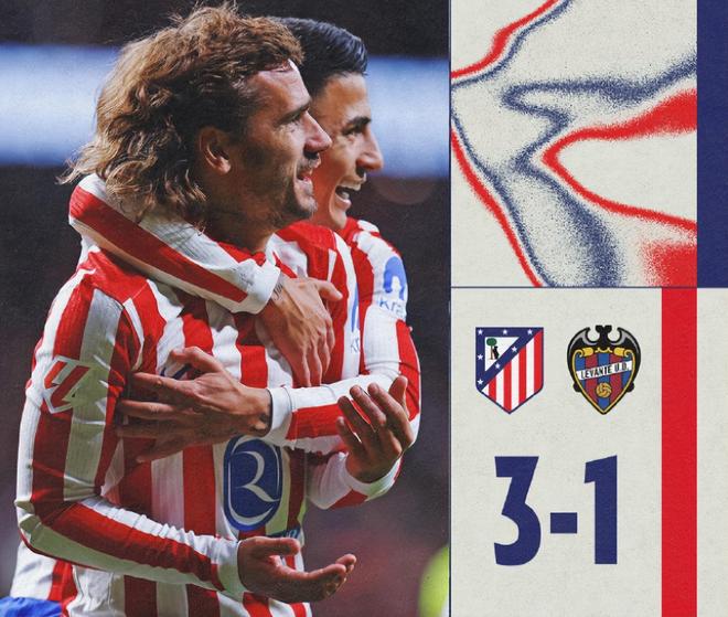 主场面对莱万特,马竞上半场开局不错,依靠一个乌龙球先下一城,随后马努-桑切斯头球破旧主,比分1-1扳平。下半场,替补出战的格列兹曼短短19分钟完成梅开二度,帮助马竞3-1再度领先,这个比分也保持到比赛结束。据统计,格列兹曼已在西甲联赛打进201球,成为历史第11人。
